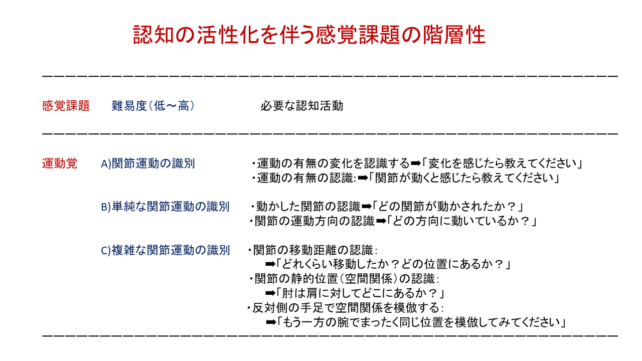 片麻痺の認知神経リハビリテーションにおいて「認知問題(空間問題と接触問題)」を適用する場合、「認知の活性化に伴う感覚課題(運動覚と触覚)の階層性」を考慮しておく必要があることを、臨床的にわかりやすく説明する[表]である。