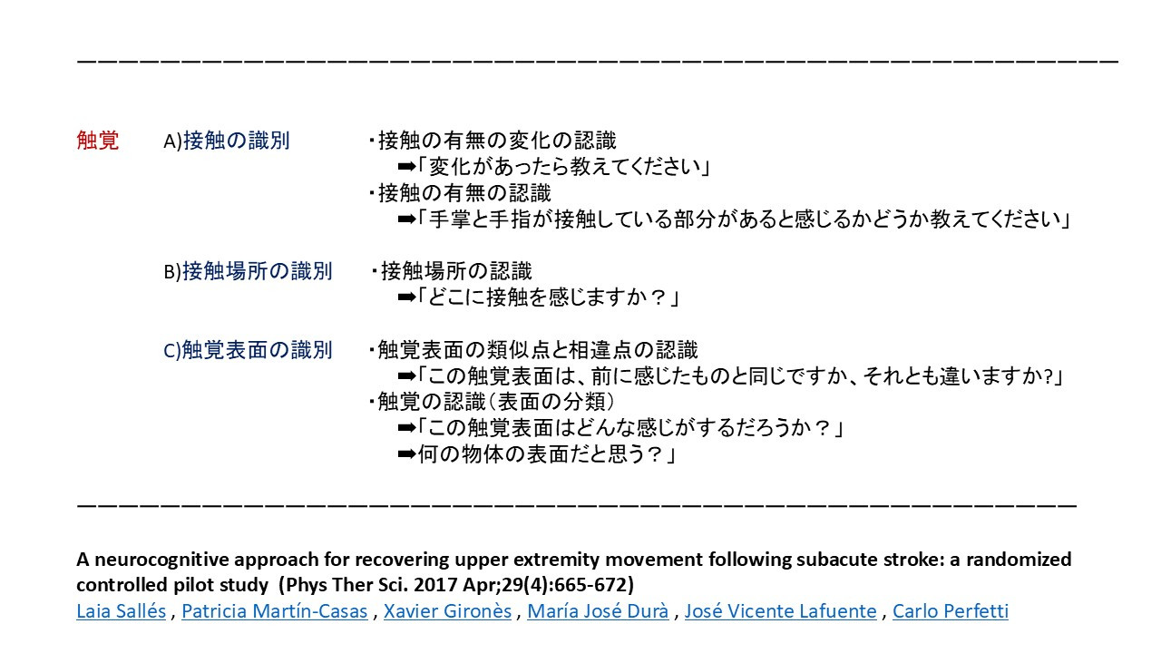 Laia Sallésらの『Nurocognitive approach for recovering upper extremity movement following subacute stroke: a randomized controlled pilot study(急性期脳卒中後の上肢の運動機能回復のための認知神経アプローチ』、Phys Ther Sci. 2017 Apr;29(4):p665-672を久しぶりに読んでいると、とても理解しやすい[表]があったので紹介したい。