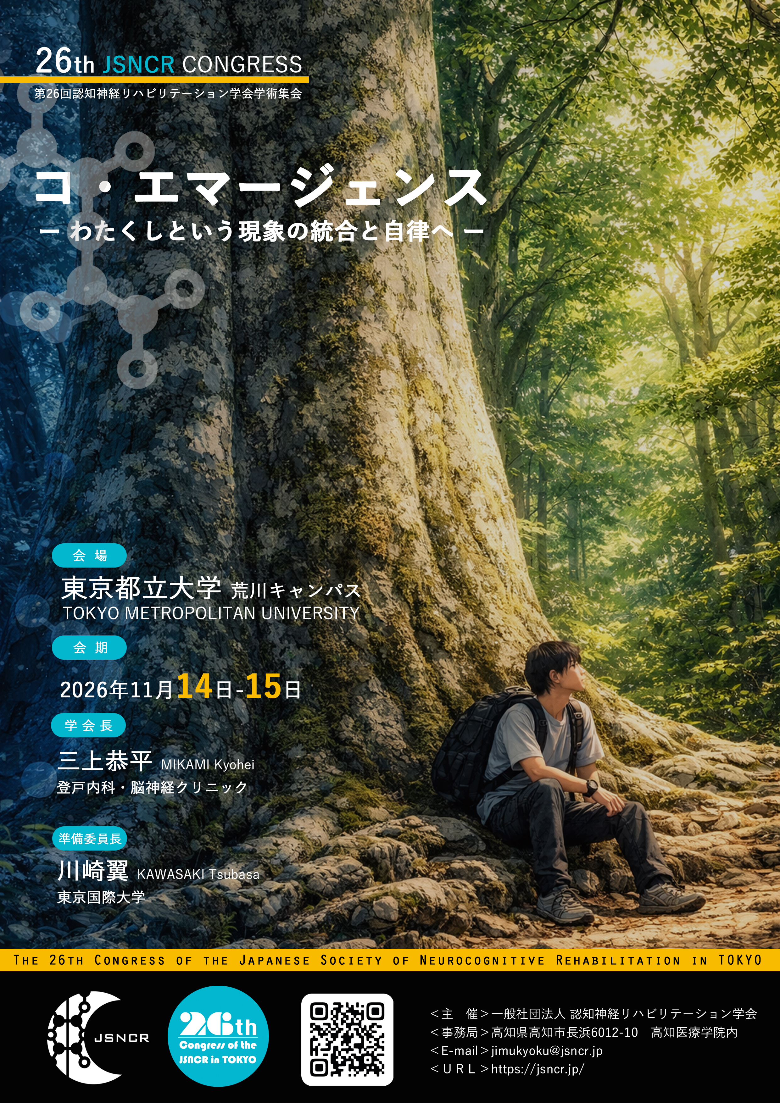 第26回認知神経リハビリテーション学会学術集会事務局 〒781-0270 高知県高知市長浜6012-10高知医療学院内 一般社団法人認知神経リハビリテーション学会 E-mail:syukai-26@jsncr.jp